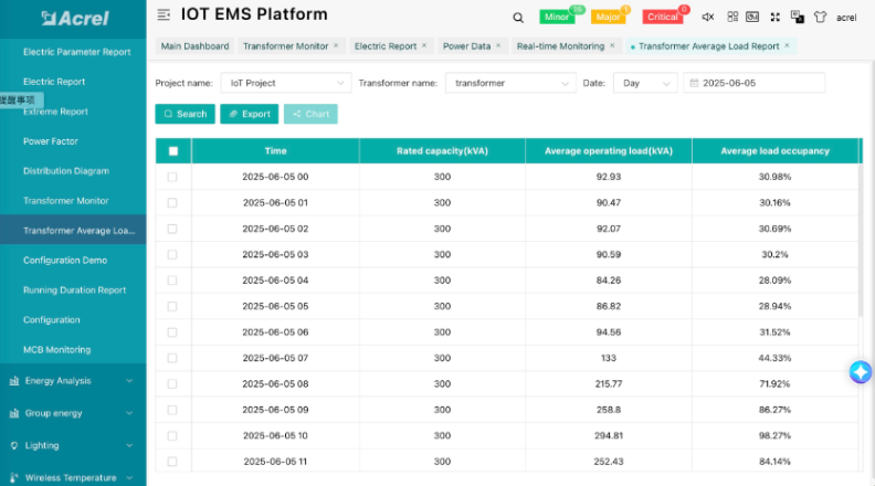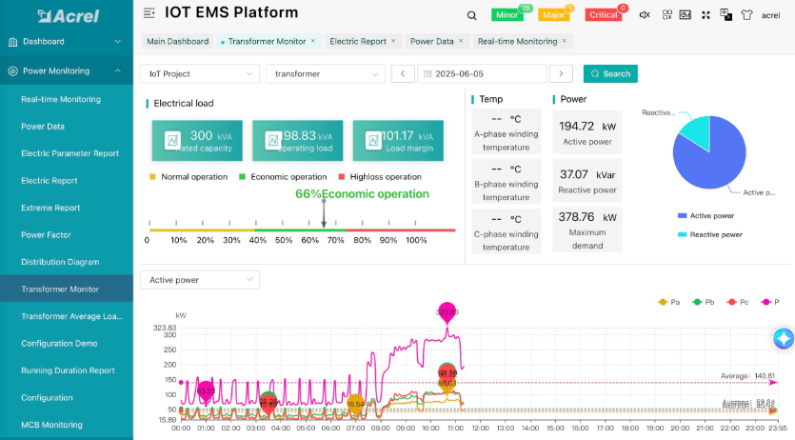 2. Visualisering av transformatordrift: Plattformen overvåker kontinuerlig kritiske parametere (strøm, spenning, effektfaktor, etc.), og sikrer at transformatorer fungerer innenfor sikre belastningsgrenser og reduserer risikoen for overbelastning og skade.