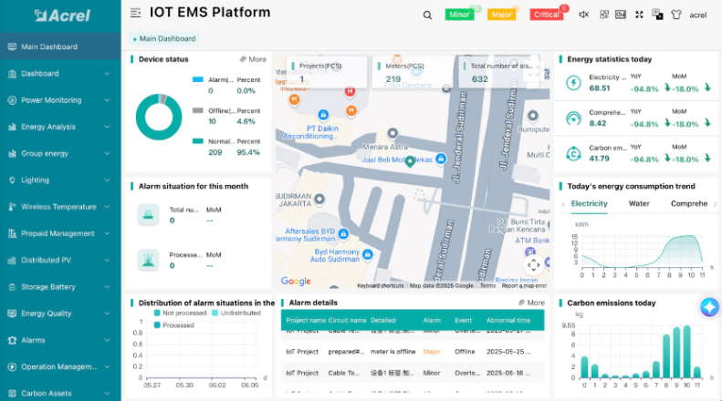 For å muliggjøre fjernbetjening og intelligent overvåking, implementerte Acrel en integrert løsning som kombinerer ADW300-4G-energimåleren med en IoT-plattform, som gir sanntidsmåling, feilvarsler og sentralisert kontroll. Den totale prosjektinvesteringen er omtrent USD 200 000.